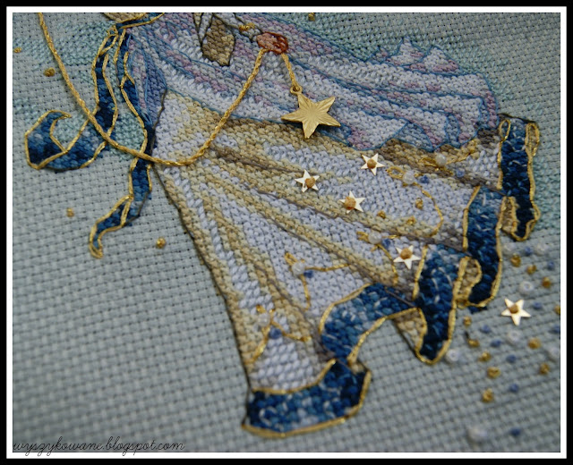 Nie wiem jak to się stało, że minął już miesiąc, od posta, w którym pokazywałam postępy z Aniołem. Pewnie myślicie, że już będzie ukończony, ale niestety nie jest tak pięknie. Były takie dni, że wyszywałam trochę Haeda, trochę Anioła, a też takie, że w ogóle igły  nie wzięłam do ręki.